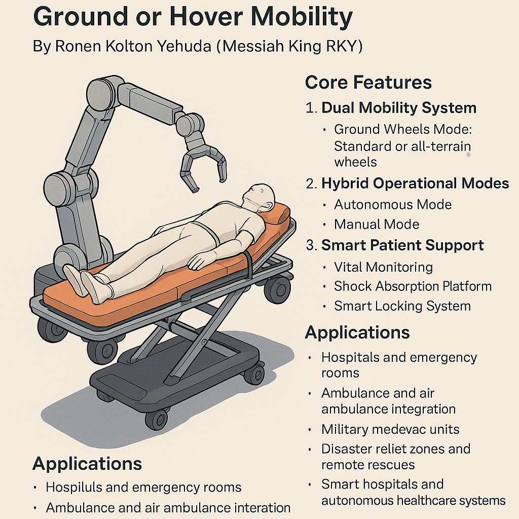 In the evolving landscape of emergency response and medical transport, innovation must prioritize both speed and adaptability. The Hybrid Autonomous Stretcher is a revolutionary device that transforms the concept of patient mobility—capable of functioning either autonomously or with manual control, and equipped with dual-mode movement: traditional ground driving and advanced hovering.