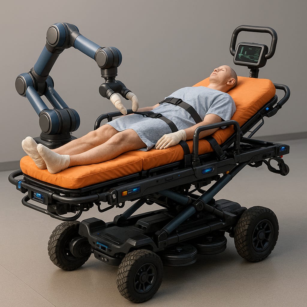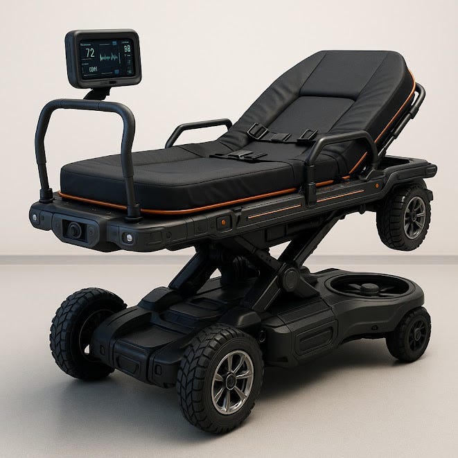Autonomous Mode: Equipped with AI, sensors, and obstacle detection, the stretcher can navigate hallways, elevators, or open fields with pre-programmed destinations.