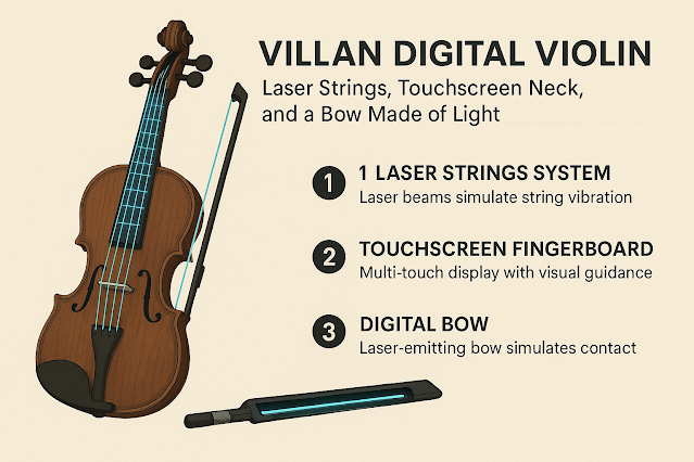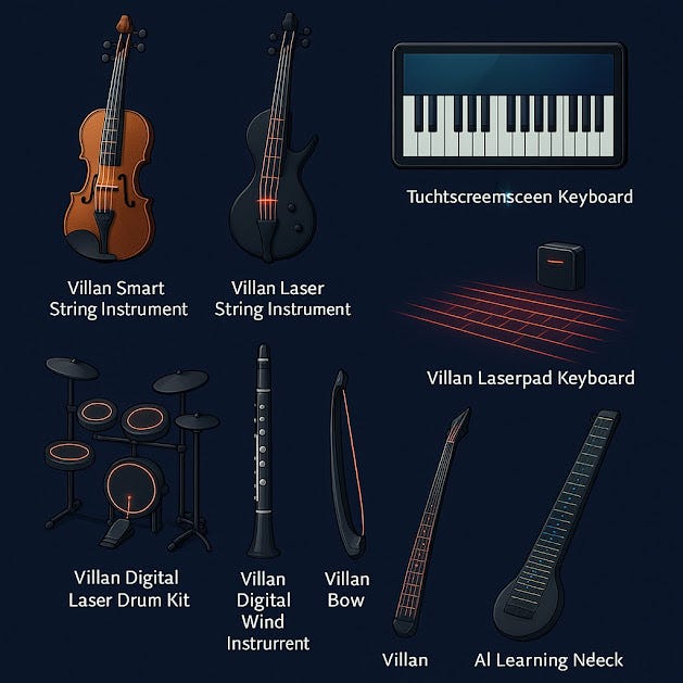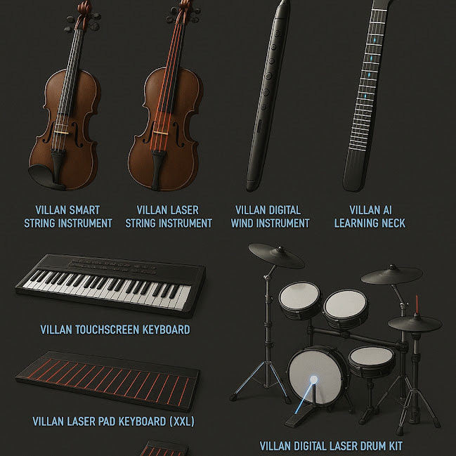 By integrating physical strings, laser beams, touchscreen surfaces, and AI learning technologies, Villan's instruments offer musicians unprecedented freedom, precision, and creative potential.