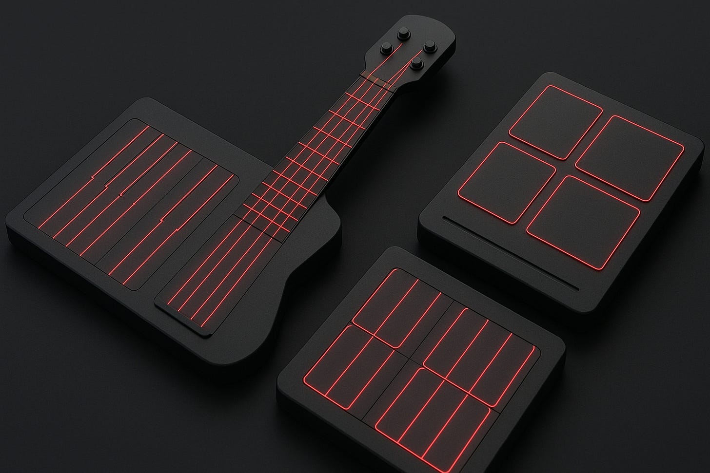 Modular devices that combine keyboard + string neck + drum pad into one portable unit.
