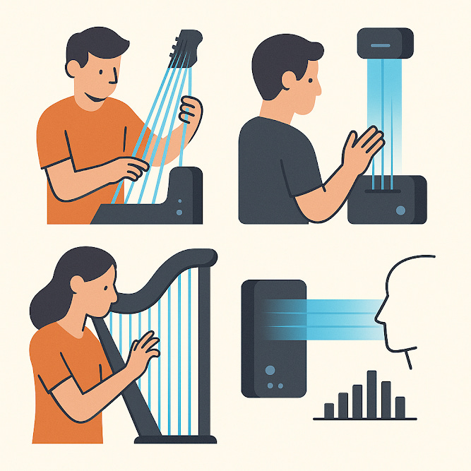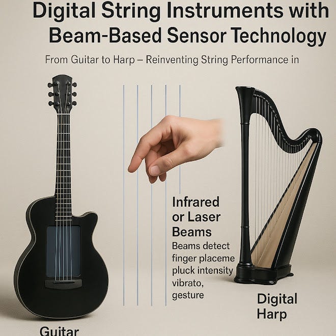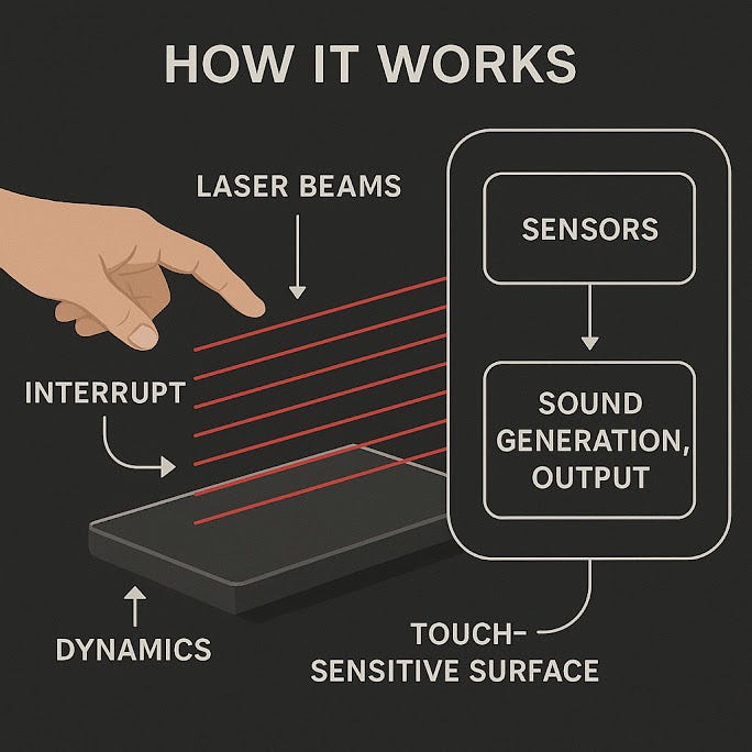 Laser "strings" react to touch, pressure, and gesture, enabling expressive play without any physical wear.