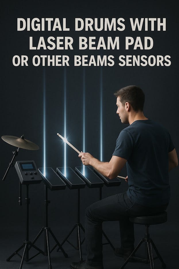 A futuristic drum kit using laser beams or invisible beam sensors instead of physical pads.