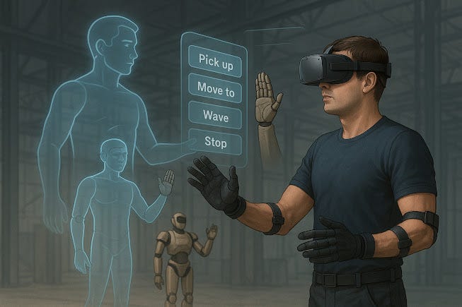 Through glasses or headsets, operators see a digital avatar of themselves and a live 3D environment where robots act.
