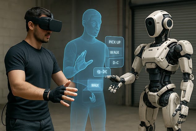 Manual Control: A human operator directly pilots the robot using wearable sensors, VR/AR interfaces, and intuitive digital avatars.