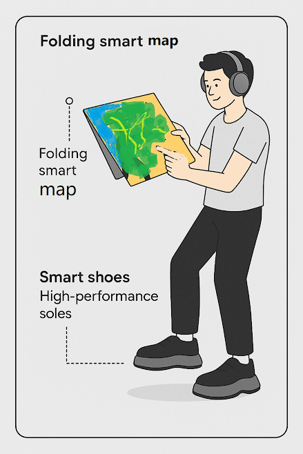 The folded touchscreen can sync with various devices like smartphones, smart shoes, PCs, smart glasses, and other connected technologies. This allows the Smart Map to display not just your current location but also alerts, navigation prompts, and health data (like step counts or heart rate) when connected to wearable devices. For example, it can pair with smart shoes to detect your pace and suggest the best route for your walk, jog, or hike.