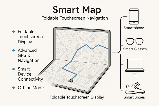 The Smart Map is an innovative foldable touchscreen device designed to revolutionize navigation and connectivity. It offers a seamless, interactive mapping experience that integrates with various devices, such as smartphones, smart shoes, PCs, and smart wearables. When unfolded, it displays a digital map and provides real-time GPS, weather updates, and route suggestions based on current conditions.