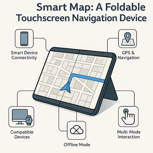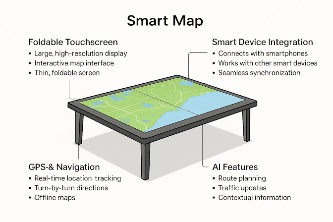 The Smart Map is distinct in its integration and application — combining foldable touchscreens with multi-device synchronization, AI-assisted navigation, offline functionality, and AR-enhanced interfaces to create a new system architecture and user experience.