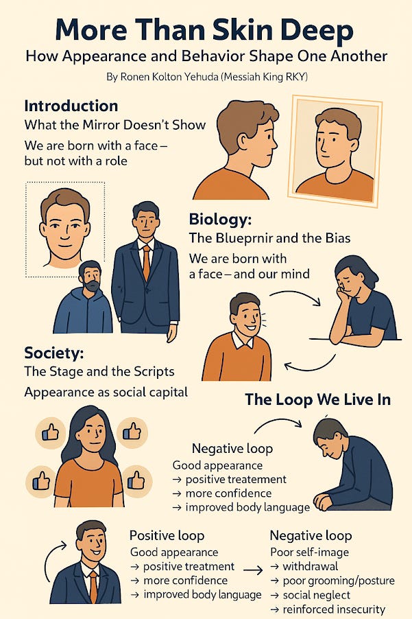 Physical appearance and behavior form a tightly woven, mutual feedback system. Our expressions, grooming, posture, and even genetics shape how others respond to us—and how we respond to ourselves. At the same time, our internal behavior, habits, and emotional states gradually mold our visible identity.