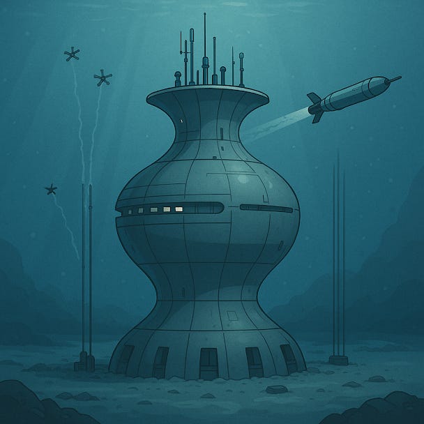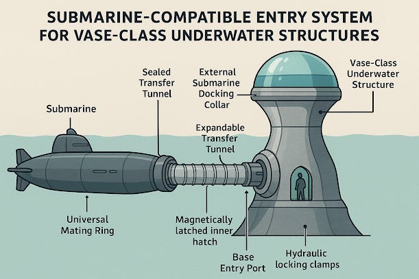 In a time when threats come from land, sky, and sea, a new ocean base design is emerging—one that is powerful, multifunctional, and shaped like an ancient amphora. The Vase-Class Underwater Defense Structure is a seafloor-based installation that integrates defense, research, surveillance, and emergency response within a hardened, modular habitat. Its design has now evolved to include glass domes, expanded interior capacity, and enhanced docking for submarines and drones.