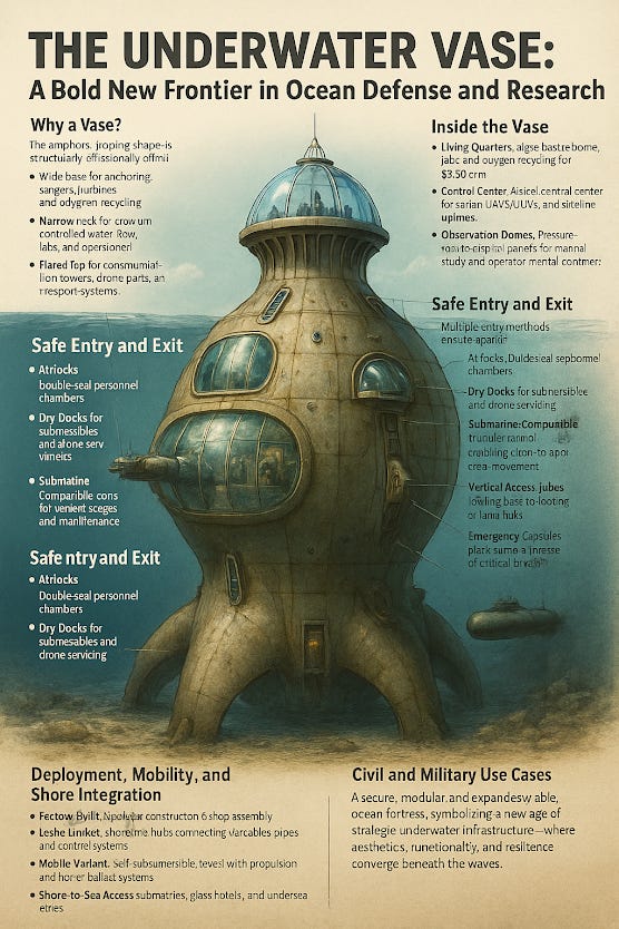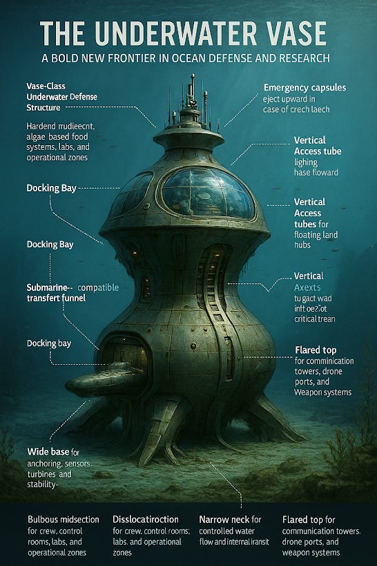 As nations deepen their maritime presence and the ocean becomes a contested theater for technology and territory, the Vase-Class structure offers a robust, intelligent, and sovereign solution. Whether used for military command, autonomous science, or international cooperation — the future beneath the surface has a new standard: the underwater vase.